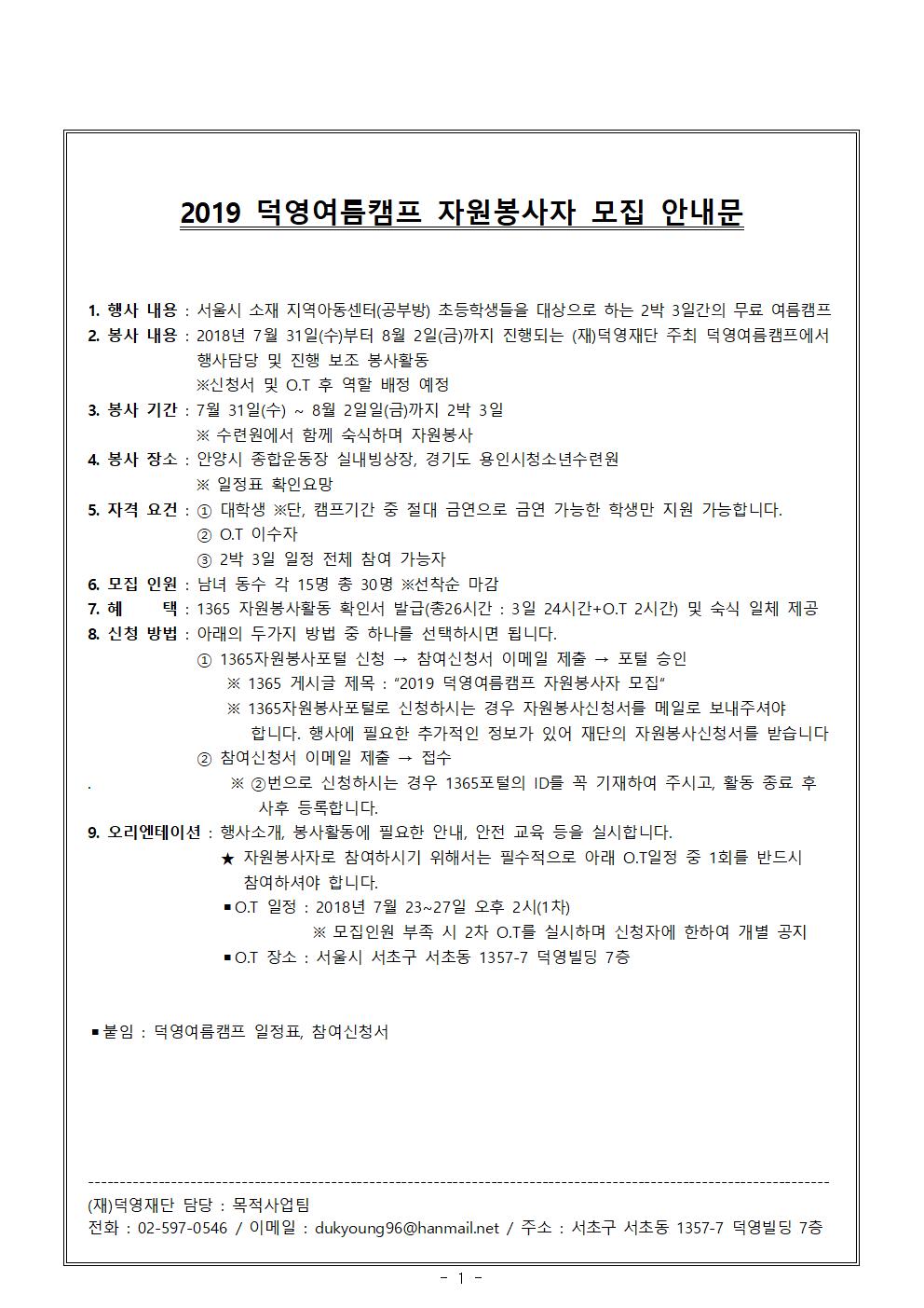 [참사람봉사단] 덕영여름캠프 자원봉사자 모집
