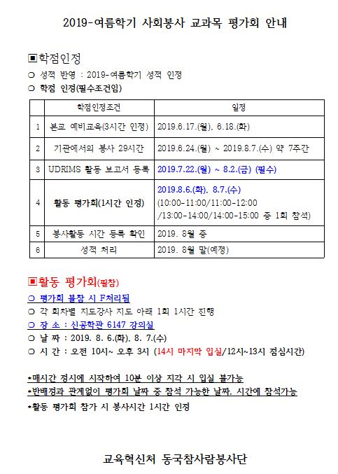 [참사람봉사단] 2019-여름학기 사회봉사교과목 평가회 안내