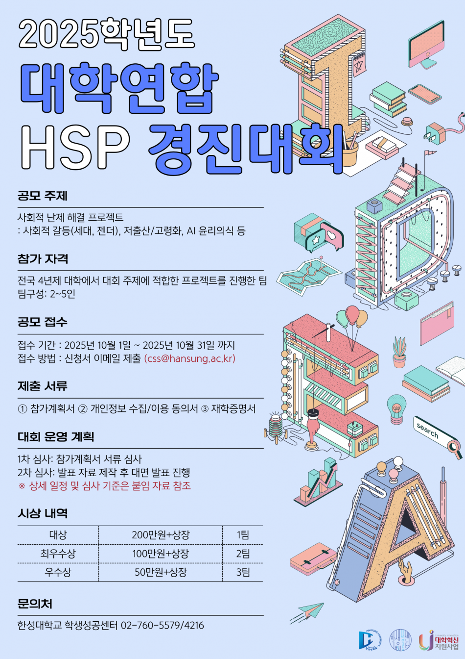 한성대학교에서 사회·경제적 발전에 따라 발생한 다양한 사회적 난제에 대한 창의적이고 실용적인 해결 방안을 공유하고자 '2025학년도 대학연합 HSP 경진대회'를 개최합니다.