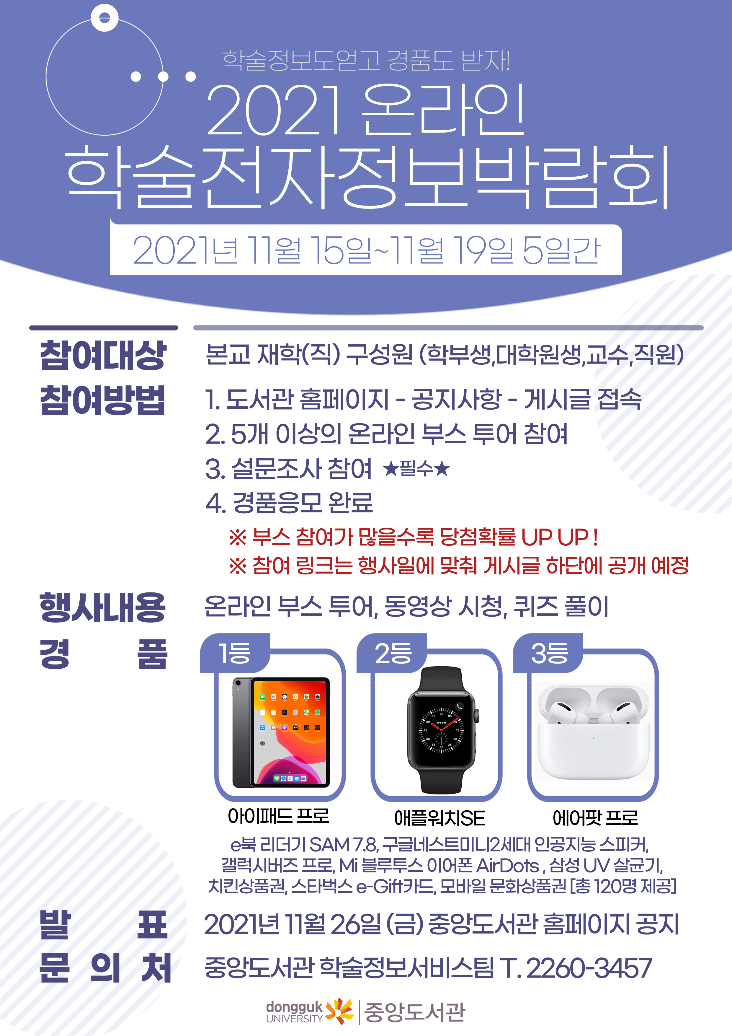 동국대 중앙도서관(관장 오병욱)은 오는 15일(월)부터 19일(금)까지 대학 구성원을 대상으로 「2021 온라인 학술전자정보 박람회」를 개최한다고 12일(금) 밝혔다.